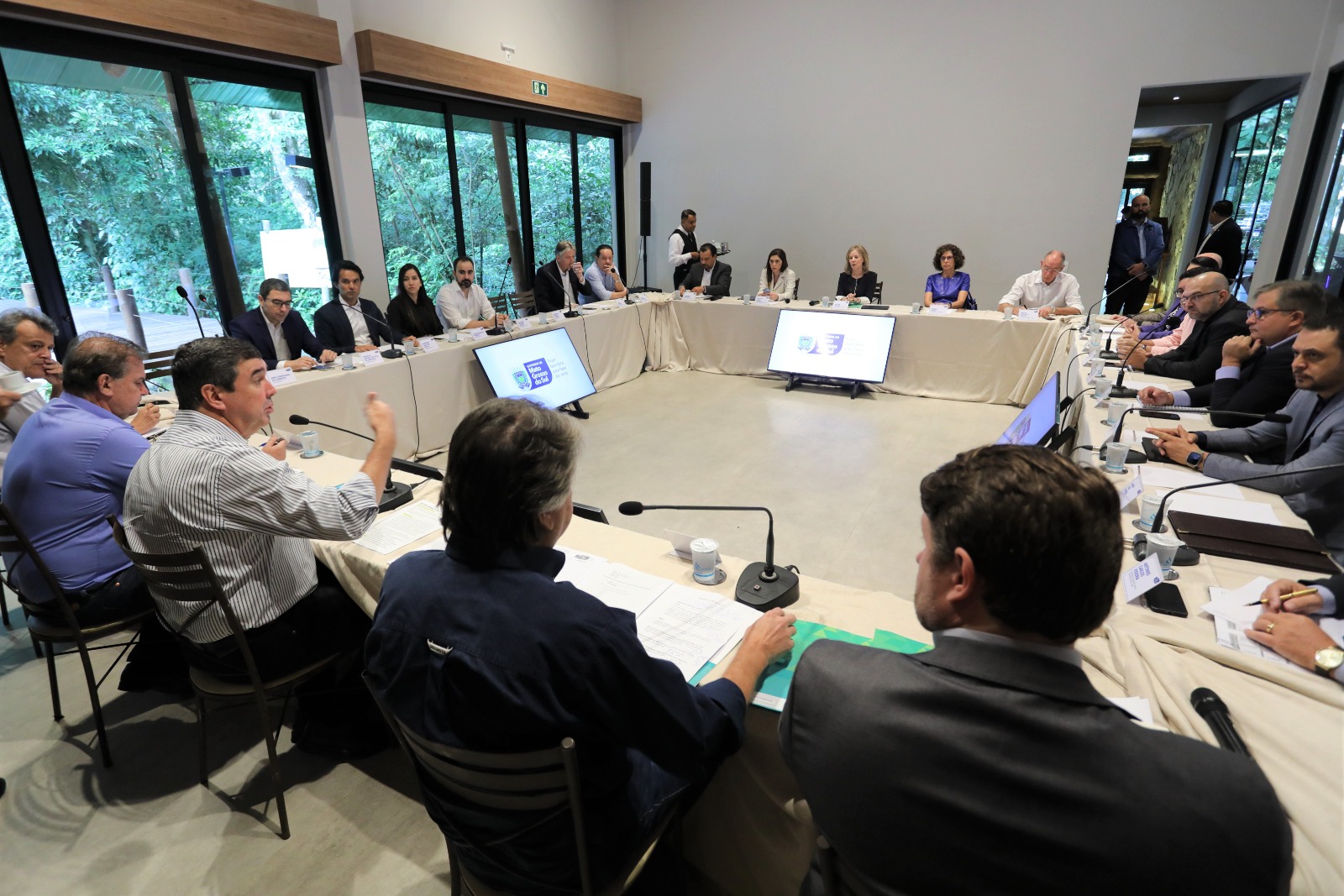 Entre projeções de novos empreendimentos e balanços dos projetos estratégicos já em execução, as parcerias público-privadas viabilizadas pelo Escritório de Parcerias Estratégicas estiveram na pauta da primeira reunião entre secretários de Estado e o governador Eduardo Riedel na manhã desta sexta-feira (23 de junho), no Receptivo do Governo, localizado dentro do Parque do Prosa.