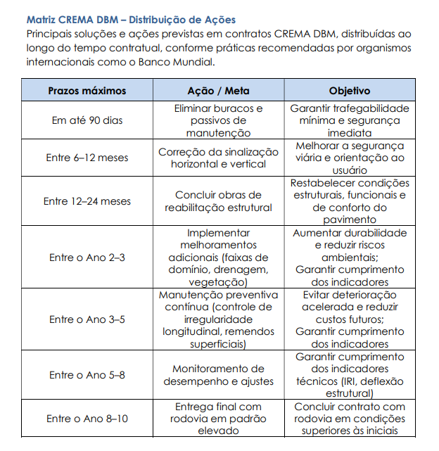 No DBM, a duração do contrato será de 10 anos, com contratação integrada de projeto, obra, manutenção e pagamento pelo Estado sendo feito com base no cumprimento de indicadores de desempenho previamente estabecidos em contrato – ou seja, os repasses não estão vinculados apenas à execução de serviços, mas também à qualidade das obras.