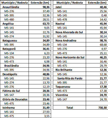 Nesse período, a empresa que ficar responsável pelo serviço terá que manter em boas condições de tráfego e segurança as rodovias MS-377 (entre Água Clara e Inocência) e MS-240 (entre Inocência e Paranaíba). São 208,7 km, todos rodoviárias, sendo 128,14 km na MS-377 (entre a BR-158 e a MS-112) e outros 80,56 km na MS-240 (entre a BR-262 e a MS-112).